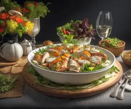 Салат "Листопад" - это вкусное и красивое блюдо, идеальное для праздничного стола. Сочетание курицы, грибов, твердого сыра и майонеза делает его невероятно ароматным и сытным. Украшенный свежей зеленью, этот салат не только порадует ваших гостей вкусом, но и станет украшением стола.